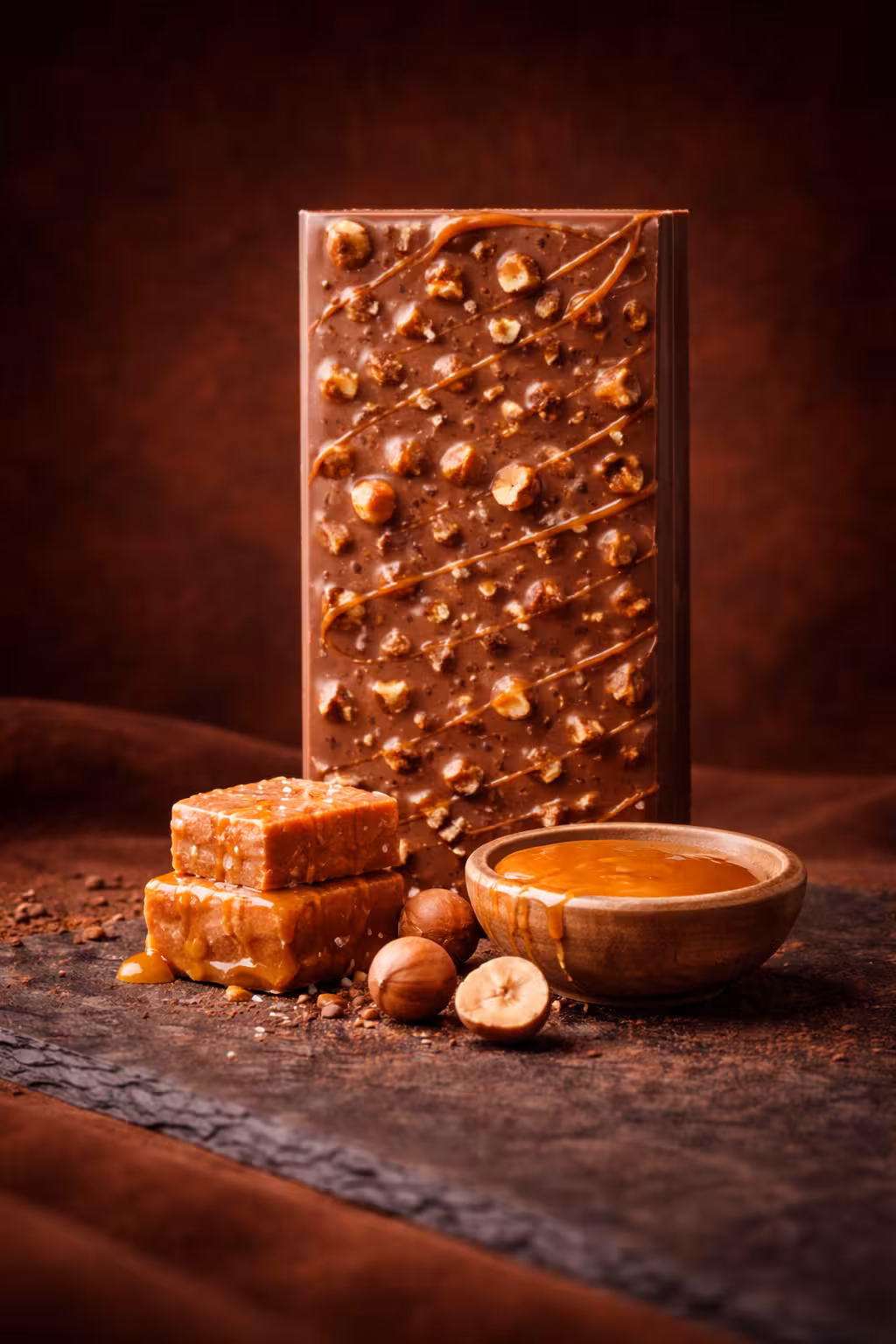 Silky caramel chocolate with toasted hazelnut and a smooth finish.