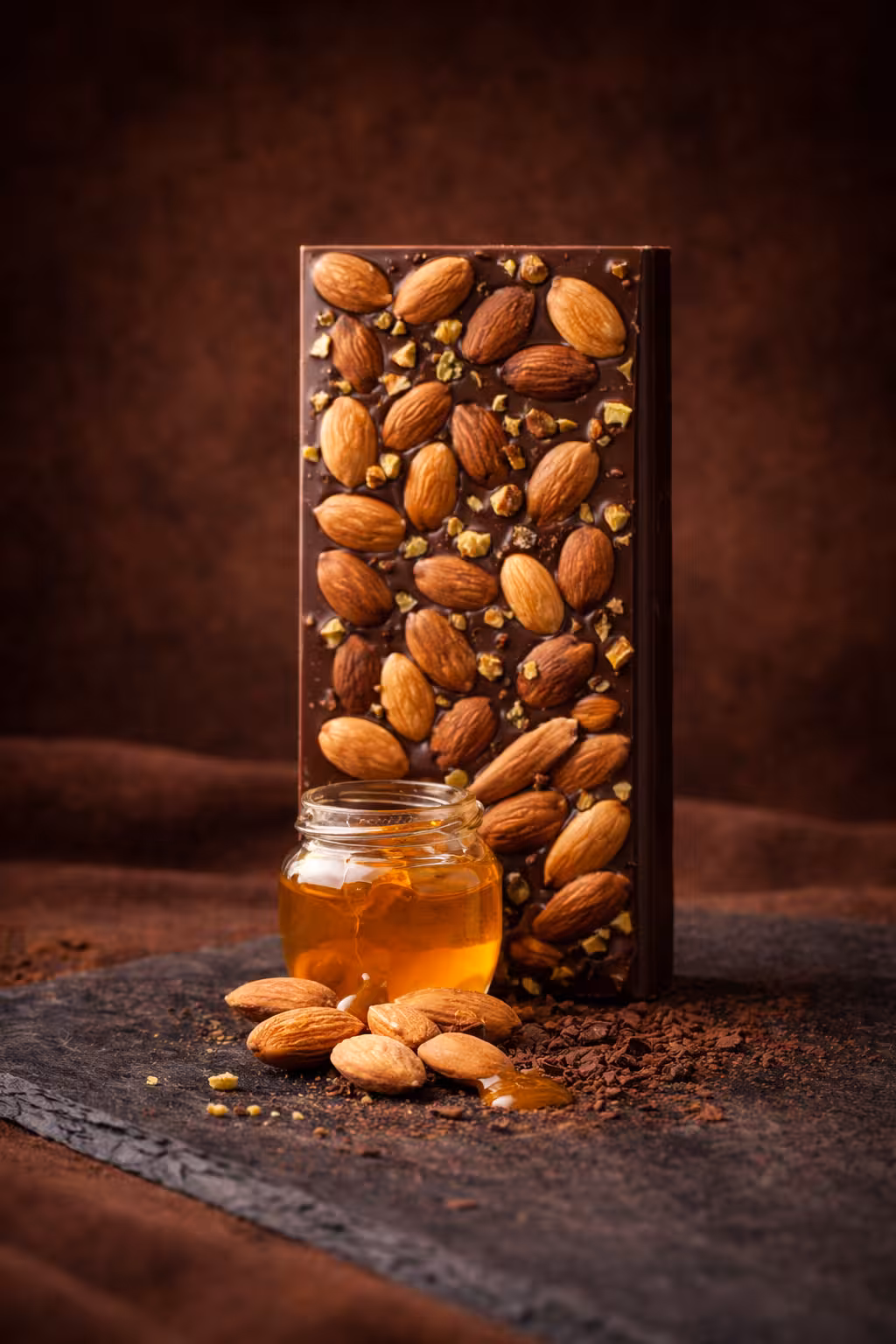 Roasted almonds and golden honey layered into a refined chocolate bar.