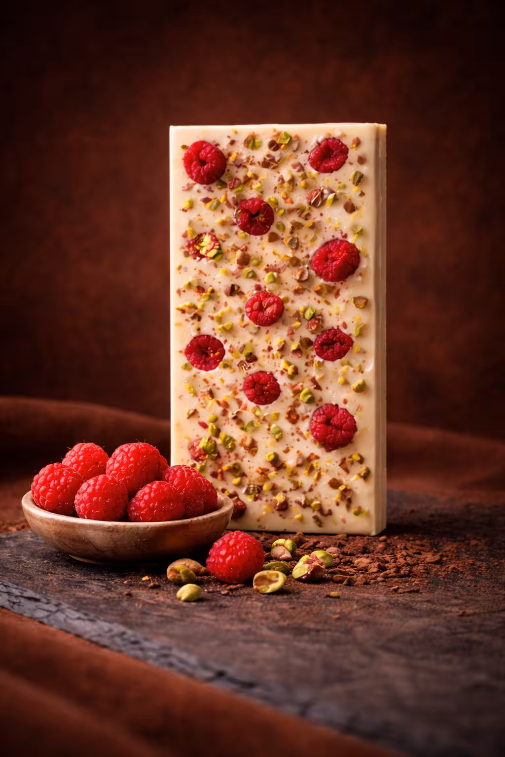 Dark chocolate enriched with raspberry notes and roasted pistachio.